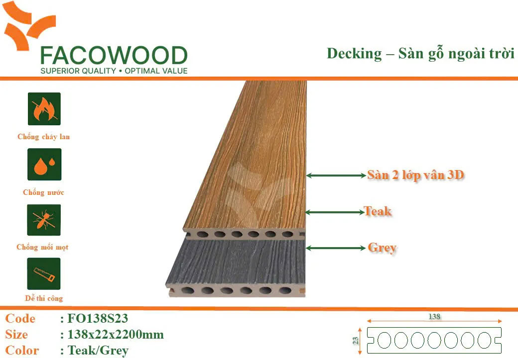 Đặc điểm của sàn gỗ ngoài trời Facowood FO138S23 Teak-Grey