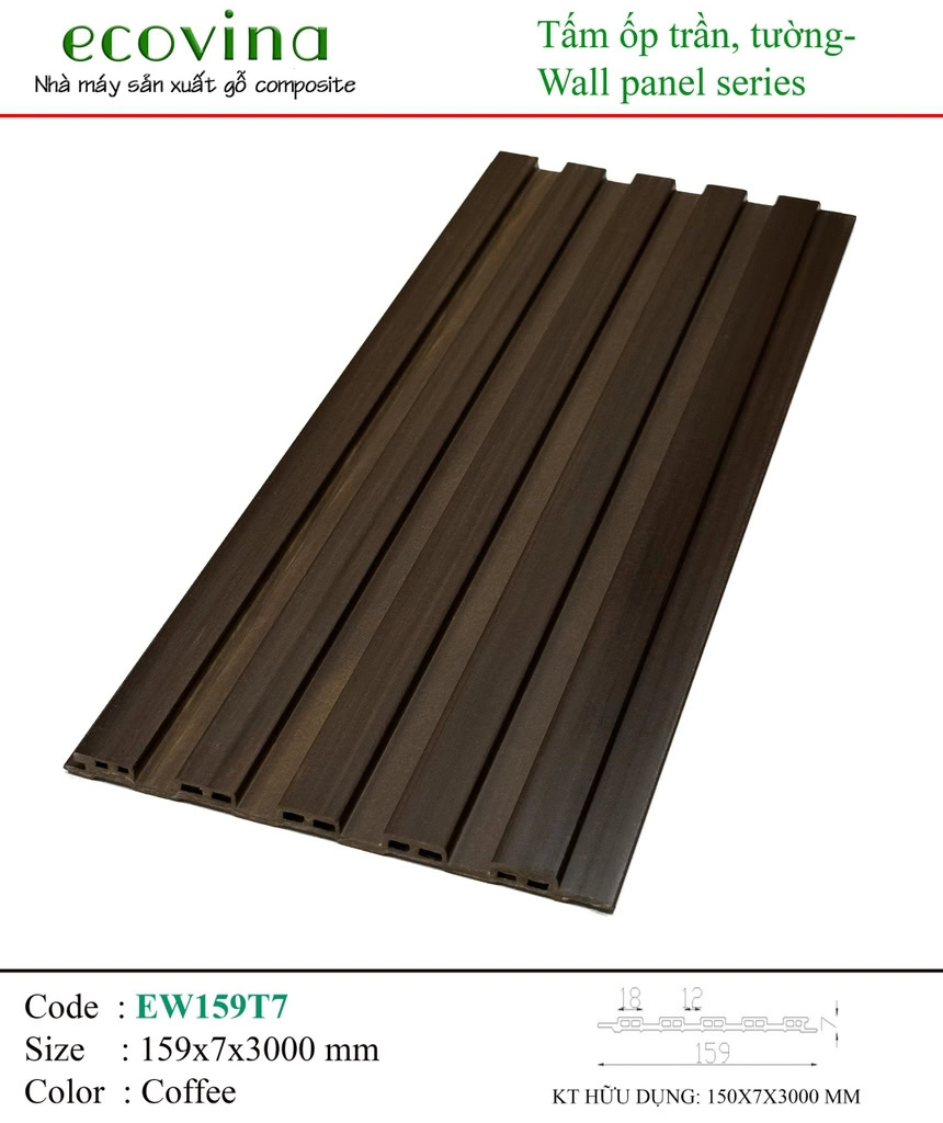 Tấm ốp lam sóng Ecovina EW159T7 Coffee là sản phẩm nhựa nguyên sinh cao cấp, không phủ film, bề mặt nguyên bản tự nhiên, bền đẹp và an toàn khi sử dụng.