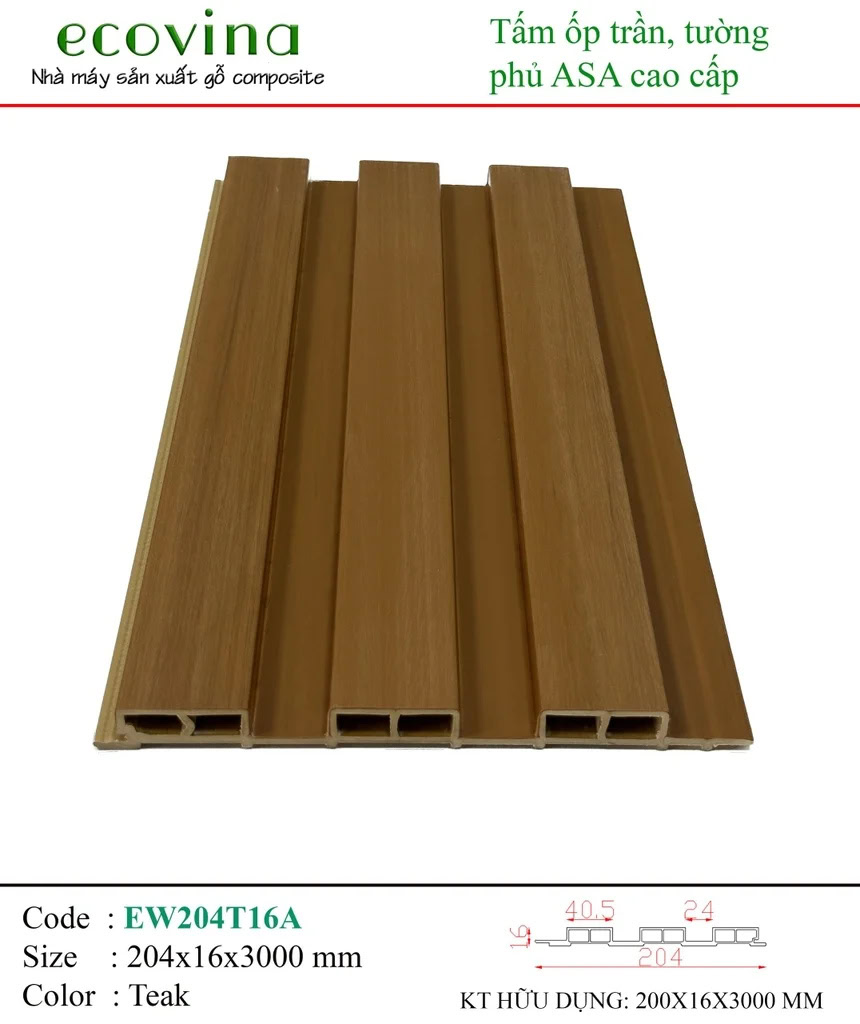 Tấm ốp PVC phủ ASA Ecovina EW204T16A Teak được dùng cho ốp trần, ốp tường, mặt tiền và vách trang trí, phù hợp cả nội thất lẫn ngoại thất. Với bản rộng 204mm, sản phẩm giúp tiết kiệm thời gian thi công nhờ che phủ nhanh, ít mối ghép. EW204T16A đặc biệt thích hợp cho các công trình cần diện ốp lớn như phòng khách, sảnh, showroom, khách sạn, biệt thự và khu thương mại cao cấp.